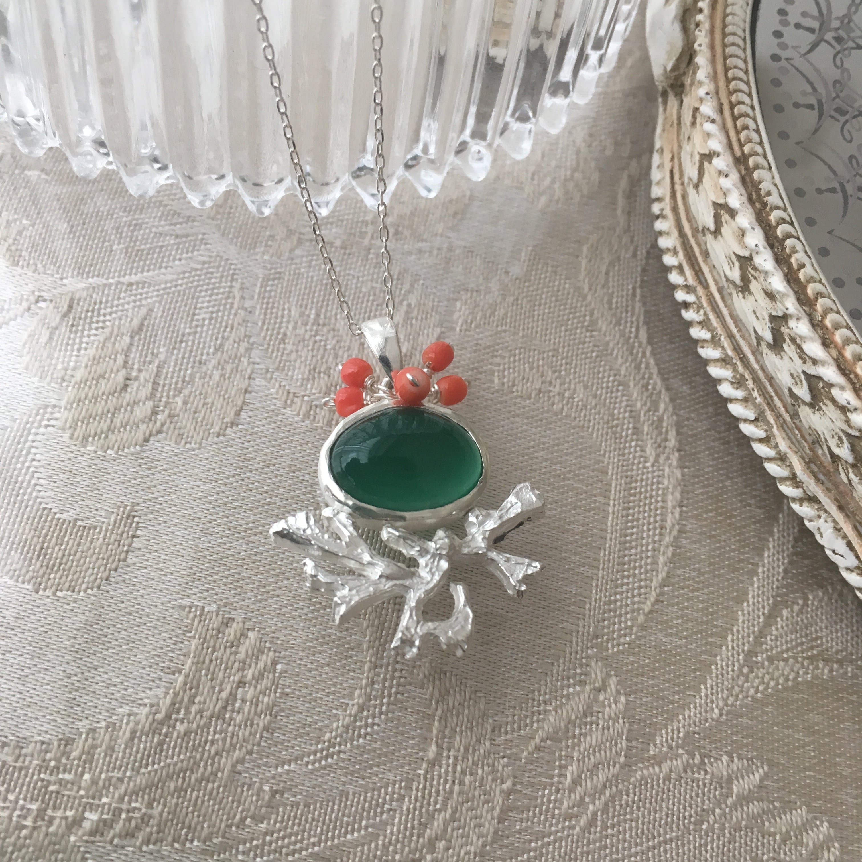 鮮やかなグリーンメノウに珊瑚のビーズを可愛く添えたペンダント。ハンドメイドの1点ものです。