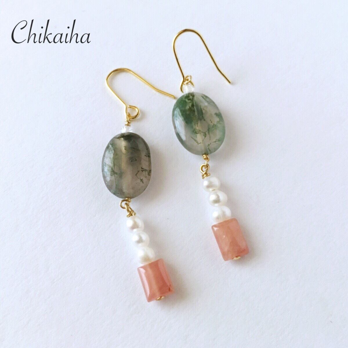 パール、モスアゲート、ロードクロサイトの組み合わせでしっとり落ち着いた色味で揺れます♡トップはキラッとホワイトトパーズの煌めき☆