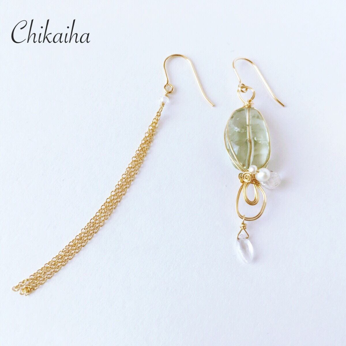 アシンメトリーのチェーンが揺れる個性的な逸品。世界でたったひとつの手作り作品をお届けします。